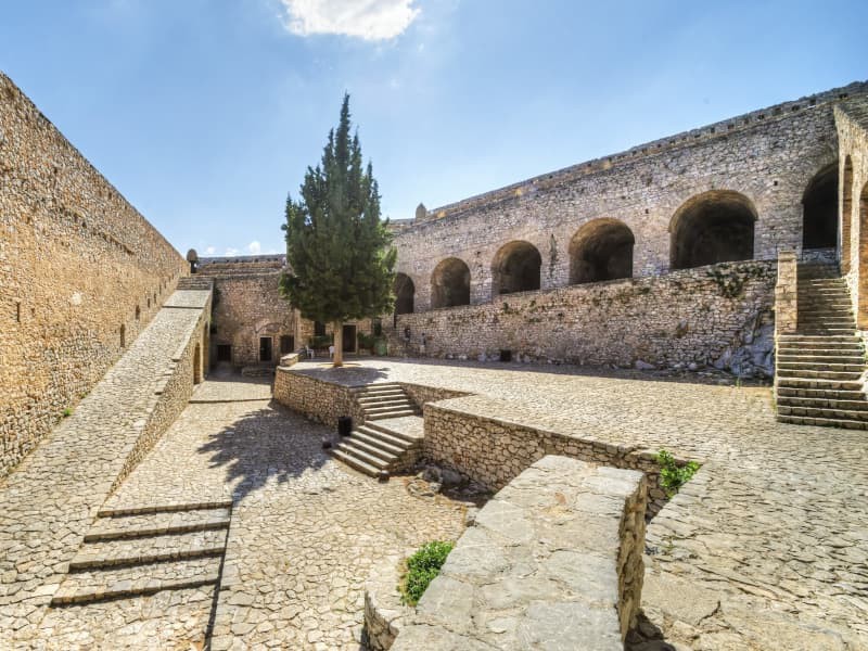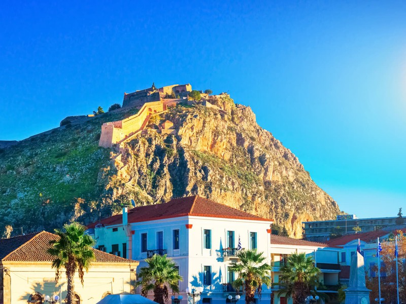 Une grande porte en argile accueille le charmant centre historique. En chemin vers le centre historique, plusieurs arrêts seront effectués ; nous découvrirons le parlement grec, le bâtiment vénitien qui abrite aujourd'hui le musée archéologique de la ville et ses 3 forteresses : la plus ancienne, celle de Acro-Nauplie qui protégeait la zone basse ; celle de Bourtzi qui flotte sur la mer, bastion de l'attaque turque, et celle de Palamède construite par les Vénitiens pour se protéger d'eux.