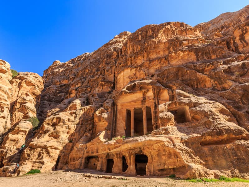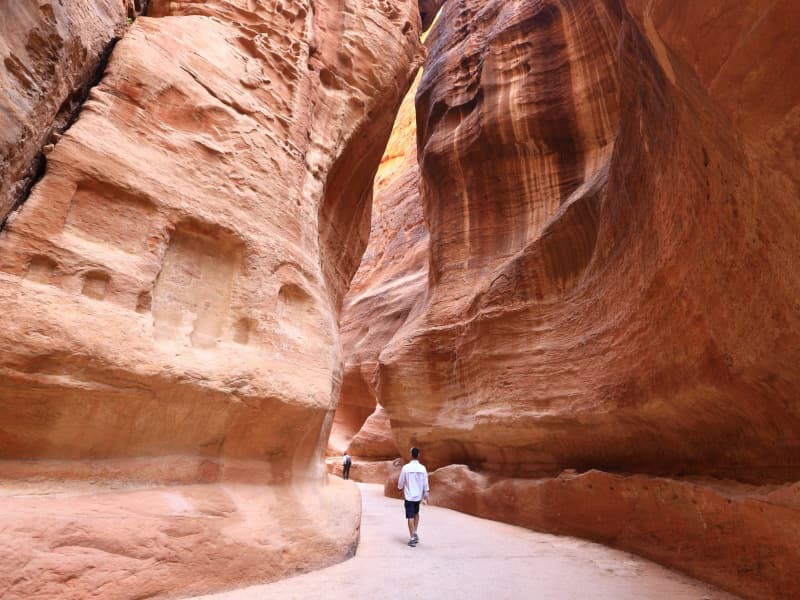 Notre visite commence dans l'impressionnant Siq, un étroit et sinueux défilé bordé de murs de roche imposants, qui nous conduira à la vue inoubliable de la majestueuse cité creusée dans la pierre et baignée par la lumière du soleil du désert.