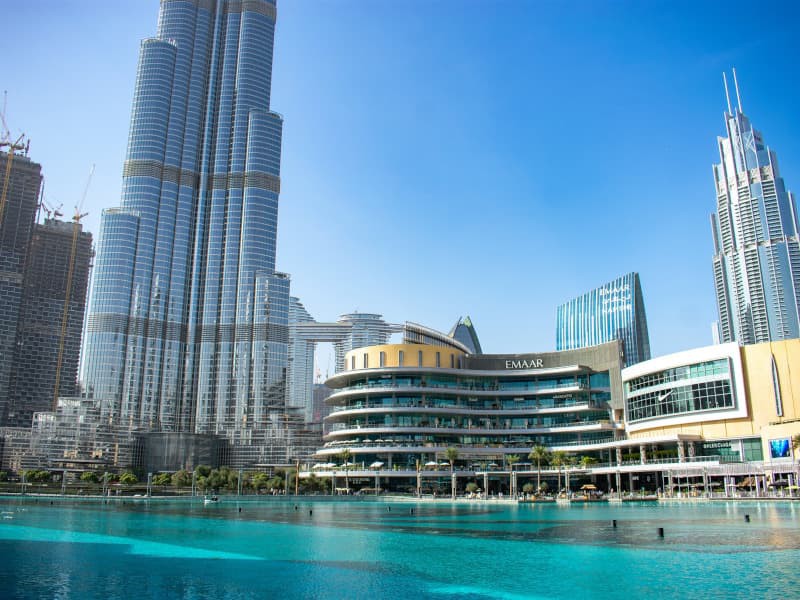 À l’une des entrées du Dubai Mall se trouve le Burj Khalifa, le plus haut bâtiment du monde. En face, vous pourrez admirer le lac et la Fontaine de Dubaï.