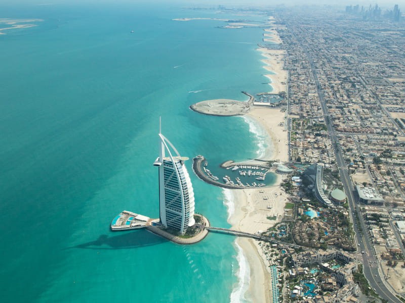 Nous traverserons le canal de Dubaï et passerons près de l'hôtel Burj Al Arab (l'hôtel le plus luxueux et célèbre du monde, le seul à posséder une catégorie 7 étoiles, en forme de voile de bateau).