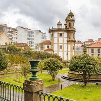 Nous visiterons le célèbre sanctuaire de la Vierge pèlerine, construit en 1778, dans le centre historique de Pontevedra, sur la place des pèlerins. Déclarée monument historique-artistique en 1982, elle mélange le baroque tardif et les formes néoclassiques, comme son retable principal, érigé en 1789. C'est l'un des bâtiments les plus symboliques et les plus importants de la ville. Il est dédié à la Vierge qui, selon la tradition, guidait les pèlerins de Baiona à Santiago. L'image de la Vierge pèlerine (XIXe siècle) est la sainte patronne de la province de Pontevedra et du Chemin portugais. Elle possède une plante en forme de coquille Saint-Jacques, symbole des pèlerins sur le chemin de Saint-Jacques. Nous nous approcherons de l'église Sainte-Marie, considérée comme l'un des joyaux de l'art galicien, située au sommet d'une colline, est construite sur une petite église romane dédiée à Sainte-Marie, qui fut la première paroisse de Pontevedra. À la fin du 15e siècle, début du 16e siècle, l'ancienne église a été démolie et la construction du nouveau temple de style gothique tardif a commencé.