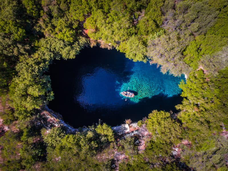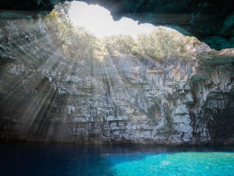 Nous nous dirigerons ensuite vers la grotte de Melissani. Dans la mythologie grecque, Melissani était la grotte des nymphes. Elle met en scène un lac bleu ciel dont le fond est tapissé de pierres. La grotte a été redécouverte en 1951 par Giannis Petrocheilos. La Grotte de Melissani est une caractéristique typique de l'environnement karstique du carbonate aquifère de la région côtière. L'axe vertical donne accès au lac (où vous pouvez faire un tour sur un petit bateau!).