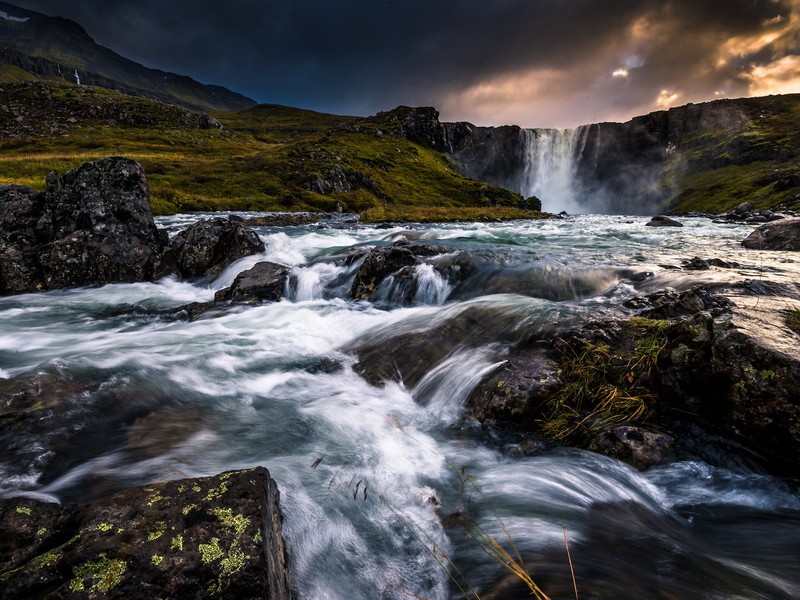 En réalité, une série de sept cascades dévalant comme un voile de mariée du sommet d'une falaise, Dynjandi vous laissera sans voix. La rivière prend sa source dans le lac Eyjavatn, dans les hautes terres de Gláma, considérées comme un glacier jusqu'à la fin du XIXe siècle. Nous nous arrêterons une heure pour profiter de la cascade et du paysage. Vous pouvez faire une courte promenade pour admirer de près la cascade la plus haute et profiter de la vue sur le fjord et les montagnes environnantes.