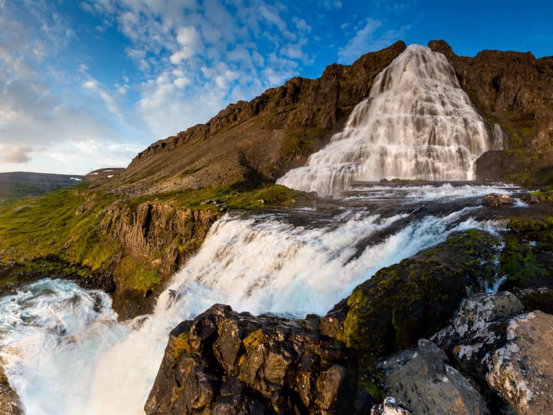 Le point culminant de notre excursion d'aujourd'hui est la majestueuse beauté de la cascade de Dynjandi, l'une des plus belles d'Islande et une icône des fjords occidentaux.