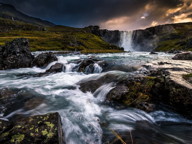 En réalité, il s'agit d'une série de sept cascades qui tombent comme un voile de mariée du bord d'une falaise, et Dynjandi vous laissera sans voix. La rivière prend sa source dans le lac Eyjavatn, sur les plateaux de Gláma, considérés comme un glacier jusqu'à la fin du XIXe siècle. Nous nous arrêterons pendant une heure pour profiter de la cascade et du paysage. Il est possible de faire une courte promenade pour admirer de près la cascade la plus haute, avec une vue spectaculaire sur le fjord et les montagnes environnantes.