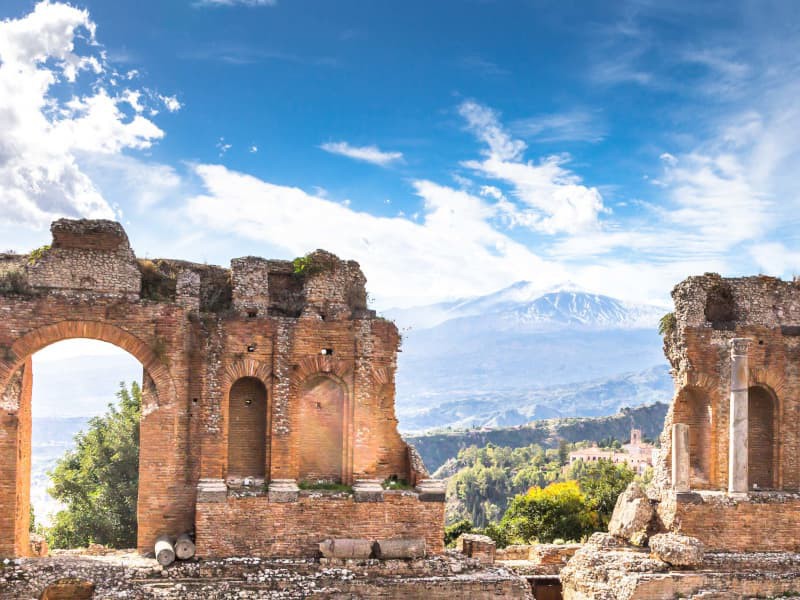 Puis vous visiterez le théâtre grec (entrée à payer sur place), étonnant par ses grands espaces, son acoustique extraordinaire et son emplacement exceptionnel. Ce théâtre, d'un diamètre de 109 mètres a été reconstruit dans le style romain au IIe siècle. C. Il est le deuxième plus grand théâtre de Sicile après Syracuse. Des hautes terres, on bénéficie d'une vue spectaculaire sur le majestueux mont Etna, le plus grand volcan d'Europe, toujours actif.