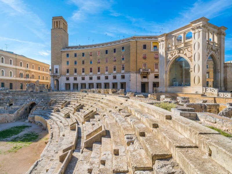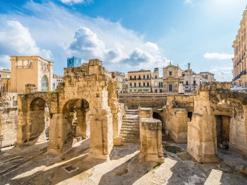 Lecce fut une ville grecque puis romaine. Notre promenade nous mènera place Sant'Oronzo, qui abrite certains des plus importants vestiges romains: l'amphithéâtre du Ier siècle après JC de 25.000 places et une colonne qui, à l'origine, marquait la fin de la Via Appia à Brindisi.