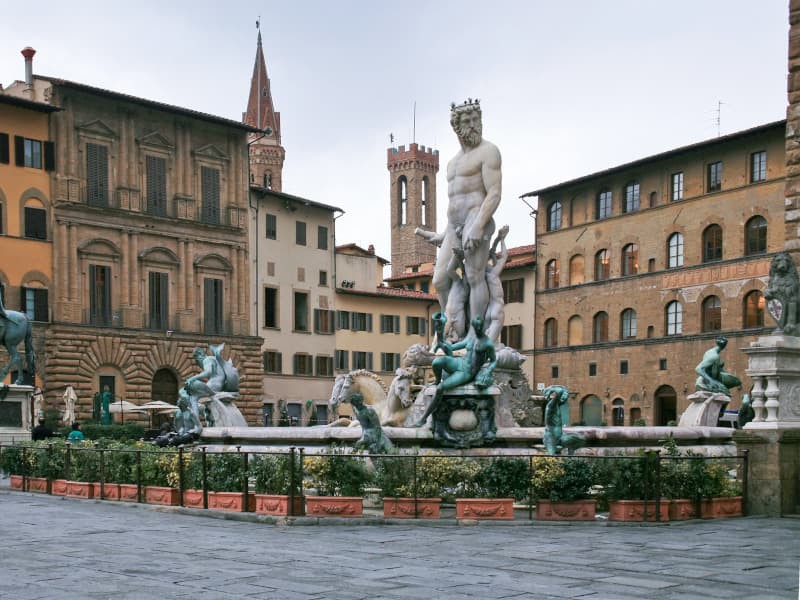 Puis nous atteindrons la célèbre Piazza della Signoria, véritable «musée en plein air" dans la ville, dominée par le Palazzo Vecchio. Ses nombreuses statues nous rappellent l'histoire de Florence et de l'Europe; spectacles de combats médiévaux entre Guelfes, Gibelins et Lorenzo le Magnifique, la Principauté de la famille des Médicis et la résurgence de l'Italie, dont Florence était la capitale entre 1865 et 1870.