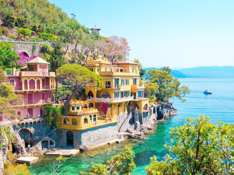 Entrée dans la magnifique baie de Portofino: autrefois paisible village de pêcheurs, avec ses maisons colorées typiques donnant sur la place et le minuscule port, Portofino est devenue ces dernières années un incontournable du tourisme international exclusif.