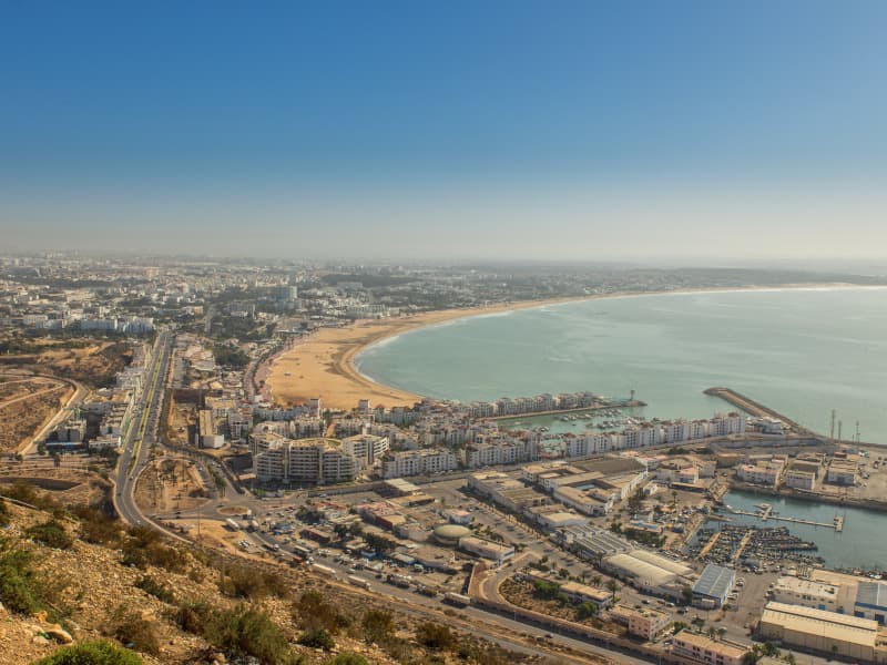 Agadir, dont le nom berbère signifie « village fortifié », est située dans le sud du Maroc. Cette ville moderne, d’environ 100 000 habitants, se distingue par sa situation privilégiée, entourée par l’Anti-Atlas, le désert du Sahara, des parcs naturels et de magnifiques plages de sable fin qui en font une destination touristique renommée. Avec plus de 300 jours d’ensoleillement par an et 10 kilomètres de plages protégées du vent, Agadir est l’endroit idéal pour profiter d’un climat parfait et de paysages uniques.