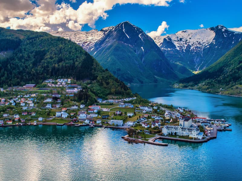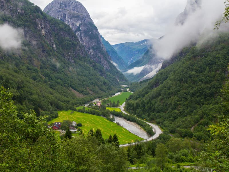 Nous traverserons de nouveau la vallée de Nærøy, cette fois en sens inverse, pour rejoindre le charmant village de Gudvangen. De là, vous profiterez de magnifiques vues sur la vallée pittoresque, le pont en bois qui traverse la rivière descendant des montagnes et l’embouchure du fjord — une image unique reflétant la grandeur de la nature nordique. À l’hôtel Gudvangen, vous pourrez vous détendre autour d’un café ou profiter d’un moment libre pour contempler le paysage.
